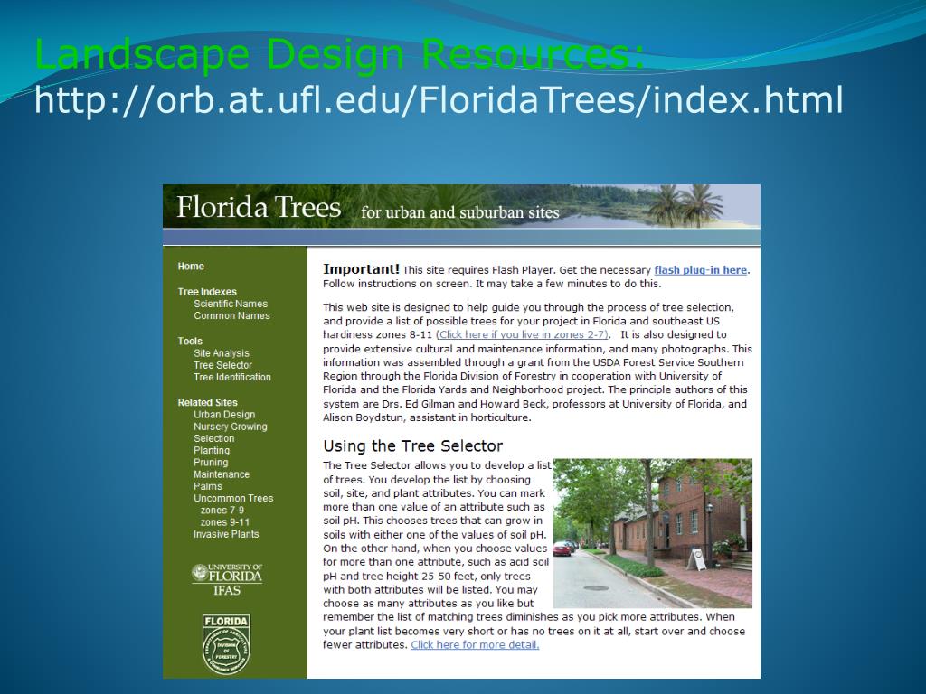 Landscape Design Resources:http://orb.at.ufl.edu/FloridaTrees/index.html