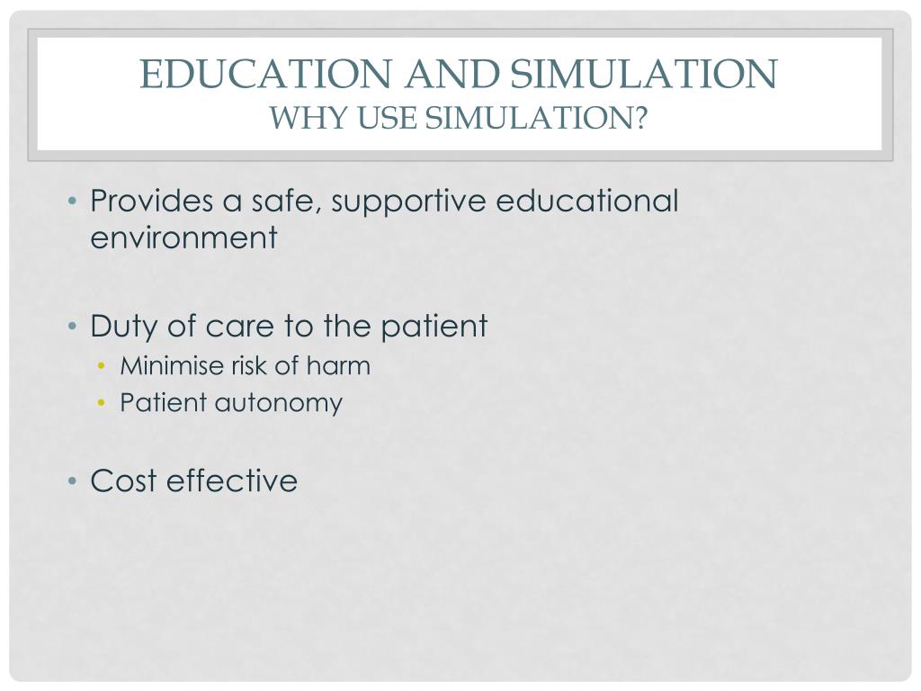 education and simulationwhy use simulation? • Provides a safe, supportive educational environment • Duty of care to the patient • Minimise risk of harm • Patient autonomy • Cost effective