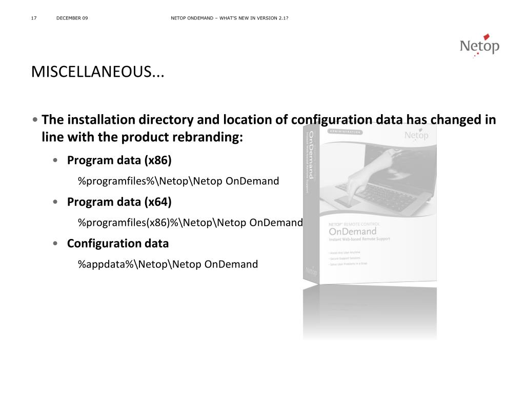 The installation directory and location of configuration data has changed in line with the product rebranding: • Program data (x86) %programfiles%\Netop\Netop OnDemand • Program data (x64) %programfiles(x86)%\Netop\Netop OnDemand • Configuration data %appdata%\Netop\Netop OnDemand NETOP ondemand – what’s new in version 2.1? miscellaneous...