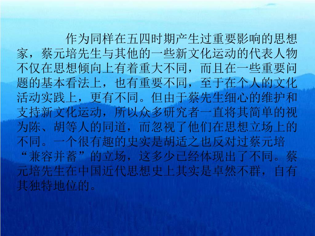 蔡元培思想探究. 03社会学 于一 b03114105. 作为同样在五四时期产生过重要影响的思想家,蔡元培先生与其他的一些新文化运动的代表人物不仅在思想倾向上有着重大不同,而且在一些重要问题的基本看法上,也有重要不同,至于在个人的文化活动实践上,更有不同。但由于蔡先生细心的维护和支持新文化运动,所以众多研究者一直将其简单的视为陈、胡等人的同道,而忽视了他们在思想立场上的不同。一个很有趣的史实是胡适之也反对过蔡元培 “ 兼容并蓄 ” 的立场,这多少已经体现出了不同。蔡元培先生在中国近代思想史上其实是卓然不群,自有其独特地位的。. “ 兼收并蓄 ” 方针的本质: