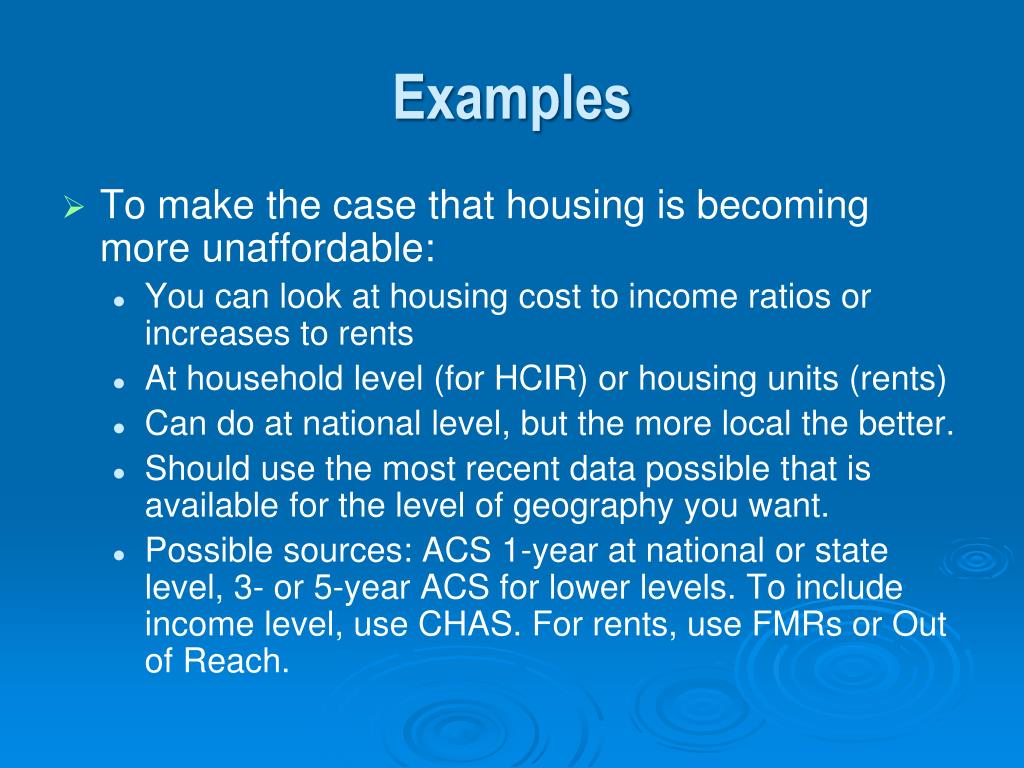 Examples • To make the case that housing is becoming more unaffordable: • You can look at housing cost to income ratios or increases to rents • At household level (for HCIR) or housing units (rents) • Can do at national level, but the more local the better. • Should use the most recent data possible that is available for the level of geography you want. • Possible sources: ACS 1-year at national or state level, 3- or 5-year ACS for lower levels. To include income level, use CHAS. For rents, use FMRs or Out of Reach.