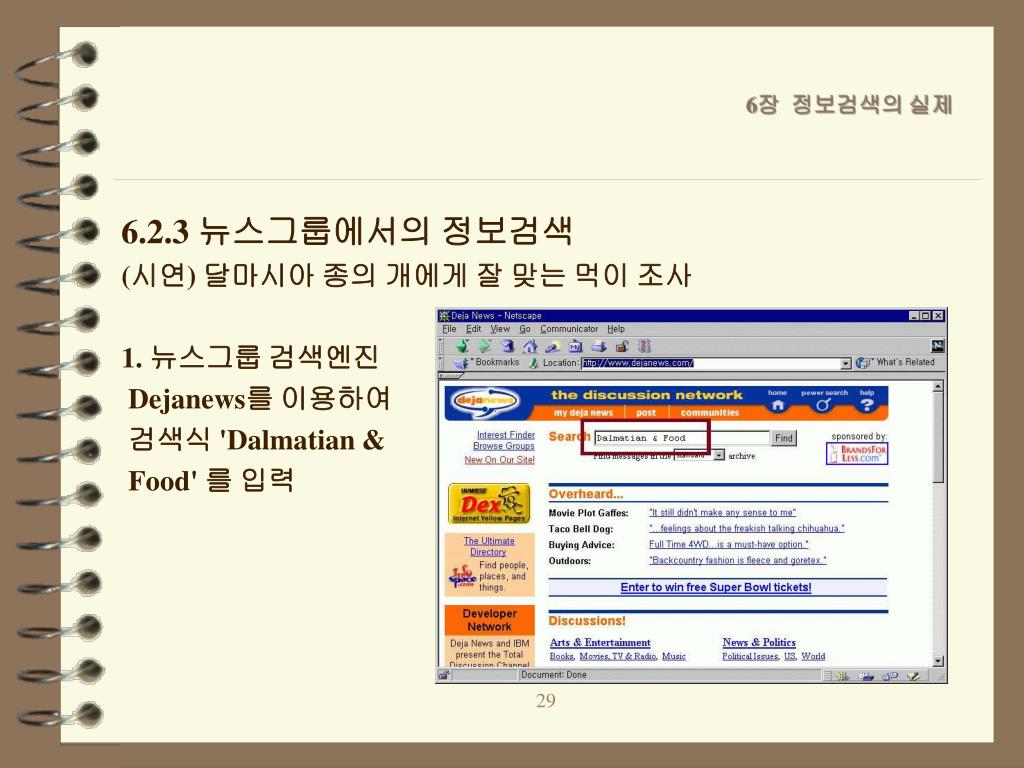 6.2.3 뉴스그룹에서의 정보검색 (시연) 달마시아 종의 개에게 잘 맞는 먹이 조사 1. 뉴스그룹 검색엔진 Dejanews를 이용하여 검색식 'Dalmatian & Food' 를 입력 29