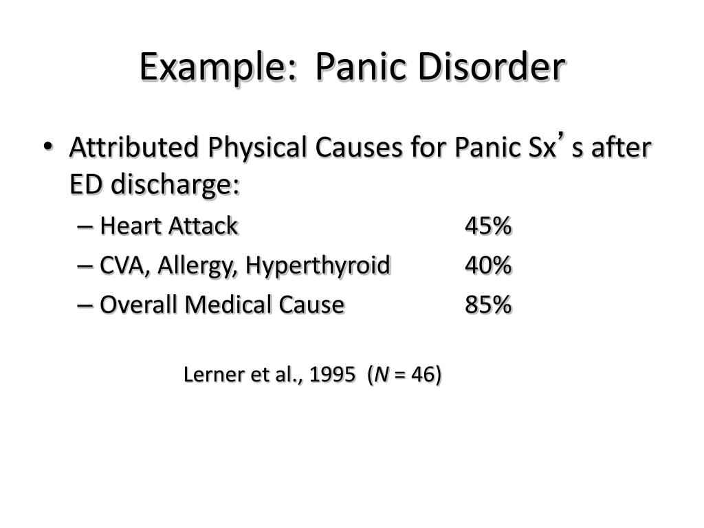 Example: Panic Disorder • Attributed Physical Causes for Panic Sx’s after ED discharge: • Heart Attack 45% • CVA, Allergy, Hyperthyroid 40% • Overall Medical Cause 85% Lerner et al., 1995 (N = 46)