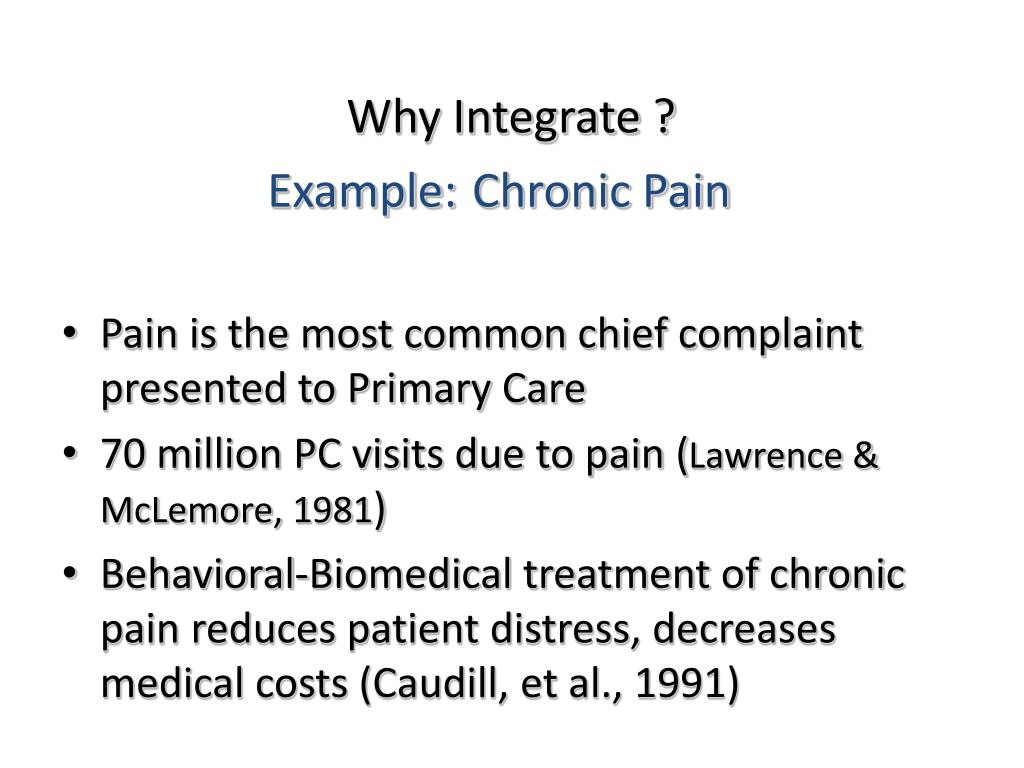 Why Integrate ? Example: Chronic Pain • Pain is the most common chief complaint presented to Primary Care • 70 million PC visits due to pain (Lawrence & McLemore, 1981) • Behavioral-Biomedical treatment of chronic pain reduces patient distress, decreases medical costs (Caudill, et al., 1991)