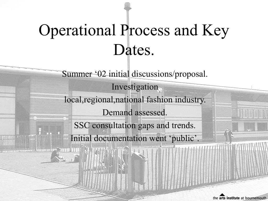 Operational Process and Key Dates. Summer ‘02 initial discussions/proposal. Investigation local,regional,national fashion industry. Demand assessed. SSC consultation gaps and trends. Initial documentation went ‘public’.