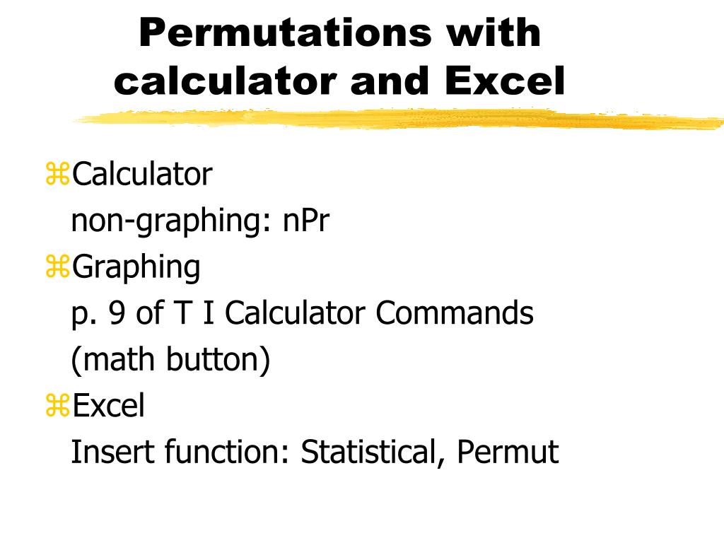 Permutations with calculator and Excel • Calculator non-graphing: nPr • Graphing p. 9 of T I Calculator Commands (math button) • Excel Insert function: Statistical, Permut