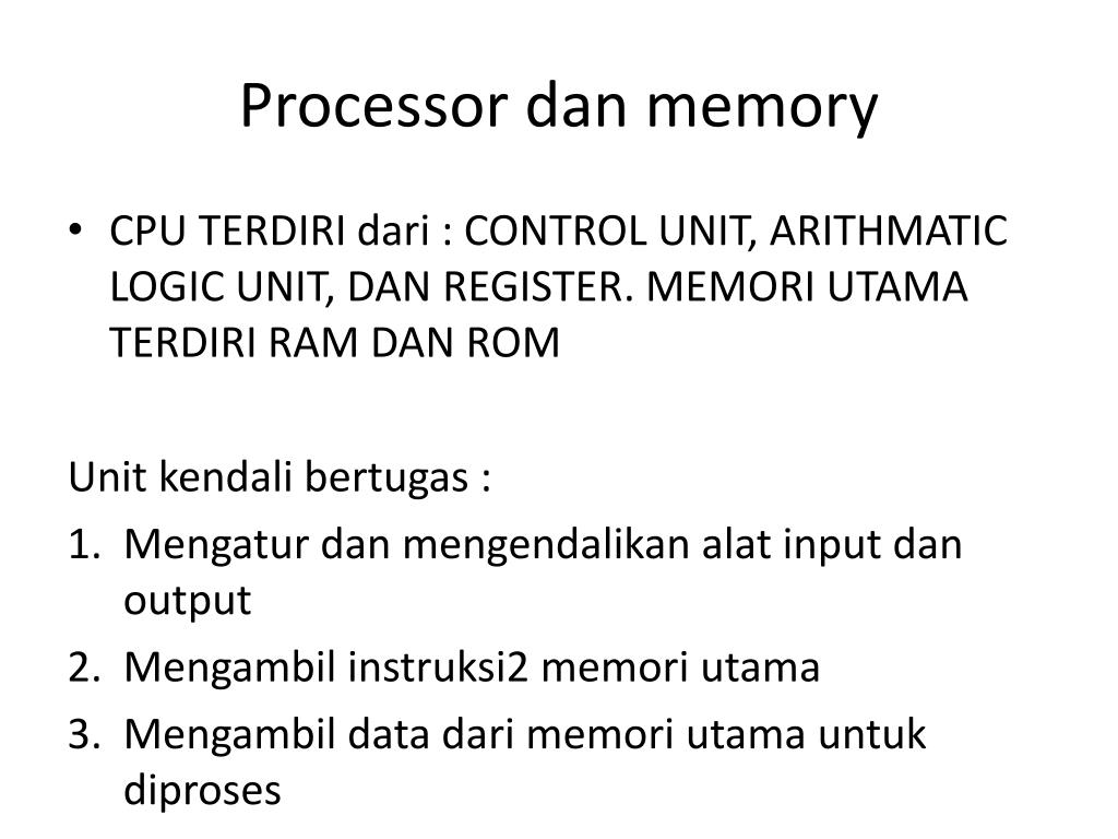 Processor dan memory • CPU TERDIRI dari : CONTROL UNIT, ARITHMATIC LOGIC UNIT, DAN REGISTER. MEMORI UTAMA TERDIRI RAM DAN ROM Unit kendalibertugas : • Mengaturdanmengendalikanalat input dan output • Mengambil instruksi2 memoriutama • Mengambil data darimemoriutamauntukdiproses • Mengiriminstruksike ALU bilaadaperhitunganarithmatika • Menyimpanhasilproseskememoriutama