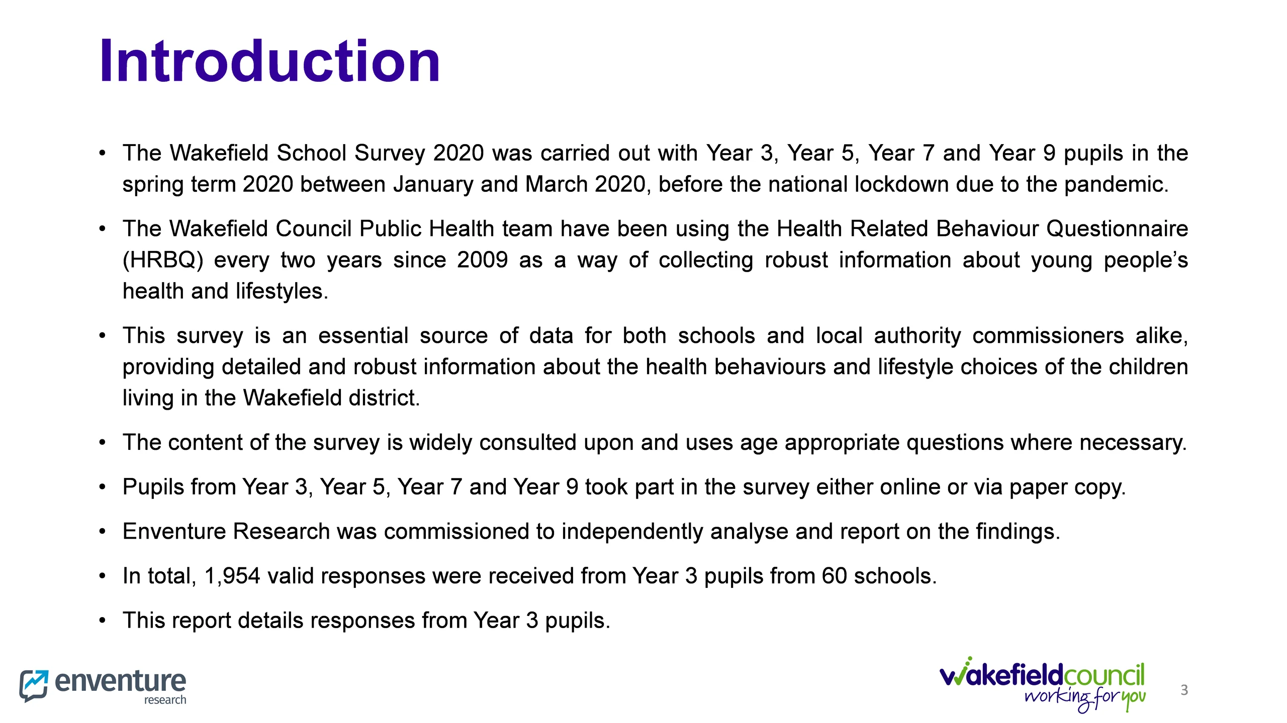 The Wakefield School Survey 2020 Report presents key findings related to diet, oral health, physical activity, smoking, bullying, wellbeing, and free time among Year 3 students. The survey conducted by Wakefield Council Public Health team provides crucial insights into the health behaviors and lifestyle choices of children in the Wakefield district.