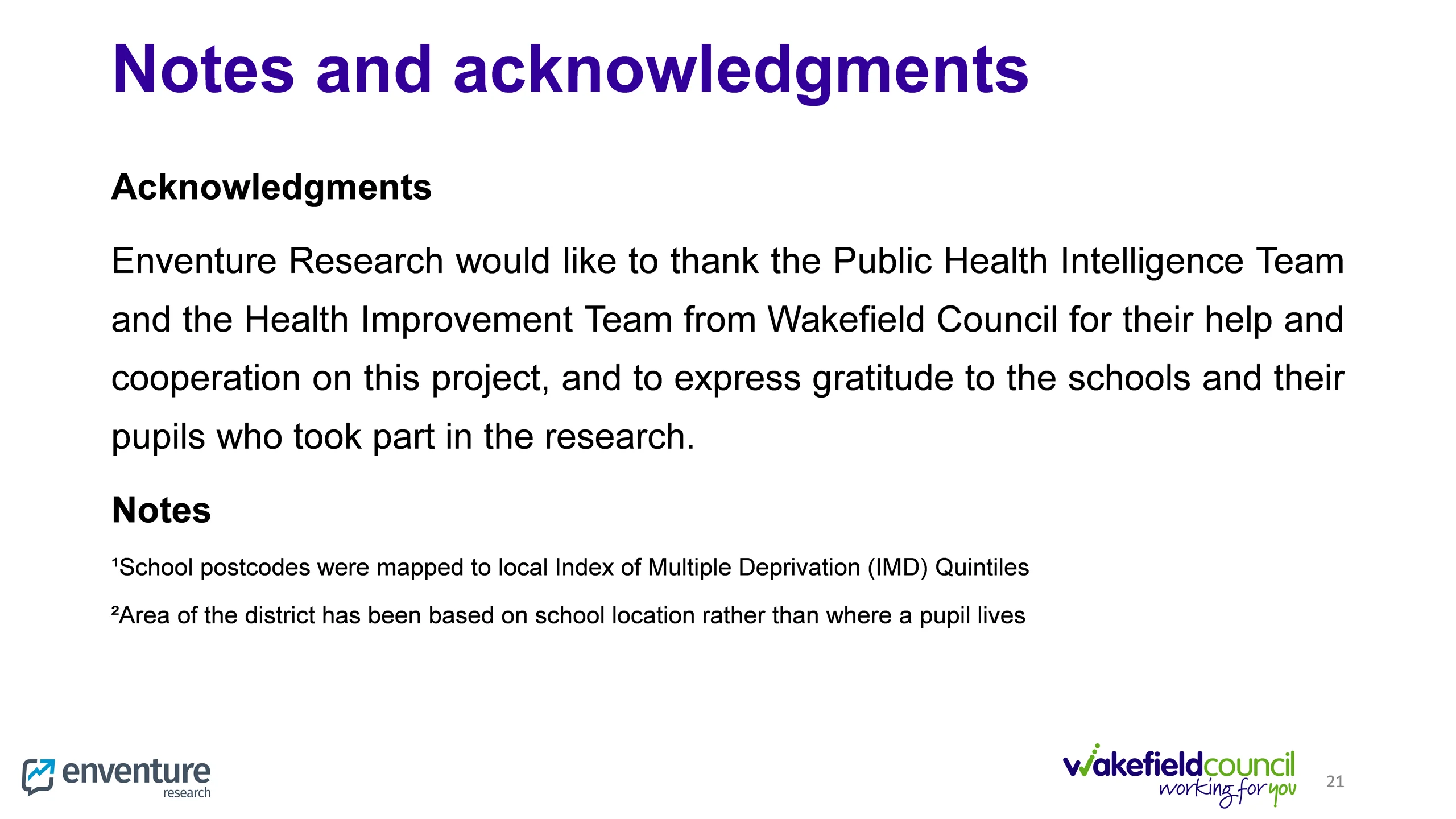 Notes and acknowledgments Acknowledgments Enventure Research would like to thank the Public Health Intelligence Team and the Health Improvement Team from Wakefield Council for their help and cooperation on this project, and to express gratitude to the schools and their pupils who took part in the research. Notes ¹School postcodes were mapped to local Index of Multiple Deprivation (IMD) Quintiles ²Area of the district has been based on school location rather than where a pupil lives 21