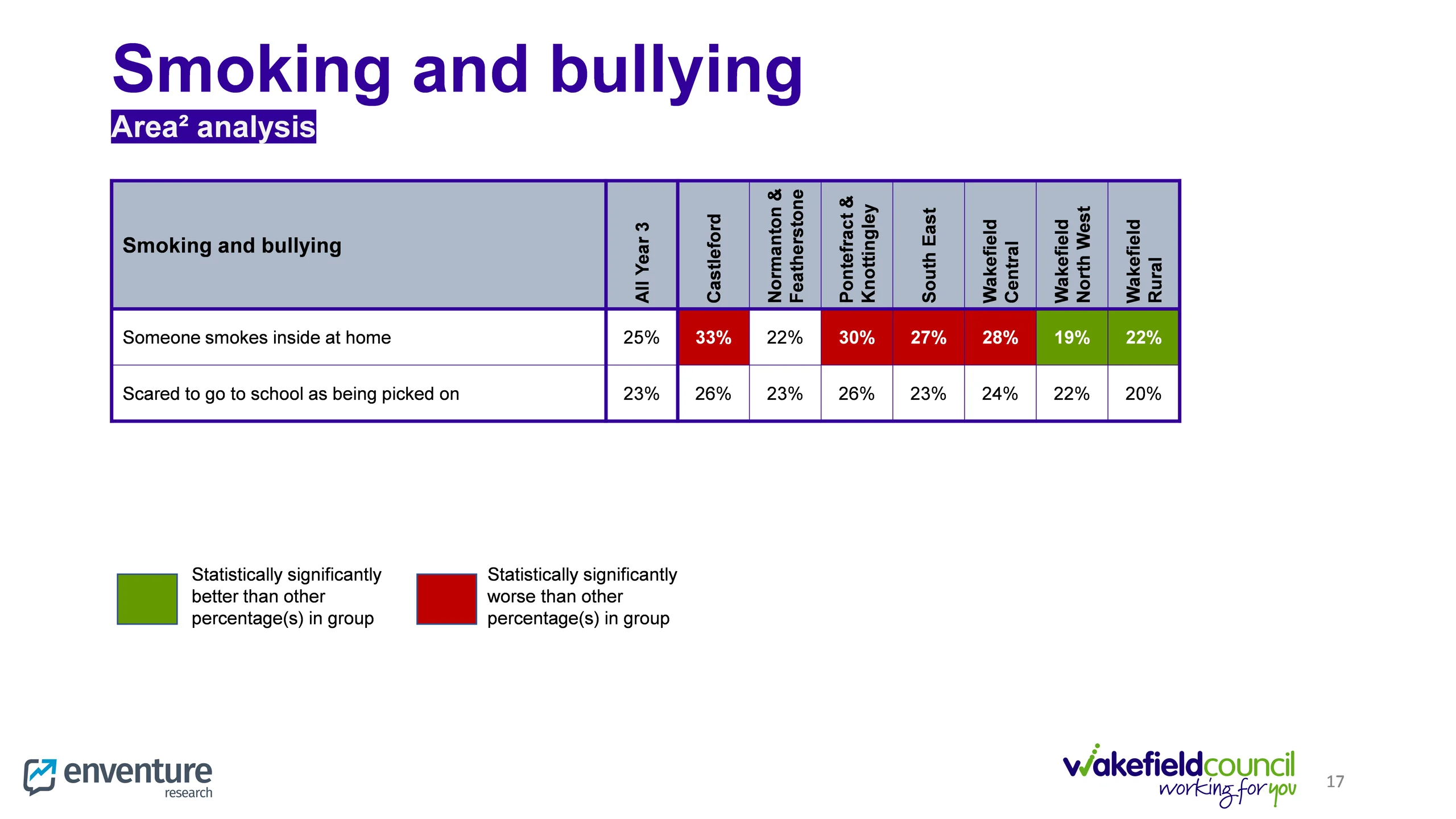 Smoking and bullying Area² analysis Normanton & Featherstone Pontefract & Knottingley North West South East Castleford Wakefield Wakefield Wakefield All Year 3 Smoking and bullying Central Rural Someone smokes inside at home 25% 22% 33% 30% 27% 28% 19% 22% Scared to go to school as being picked on 23% 26% 23% 26% 23% 24% 22% 20% Statistically significantly better than other percentage(s) in group Statistically significantly worse than other percentage(s) in group 17