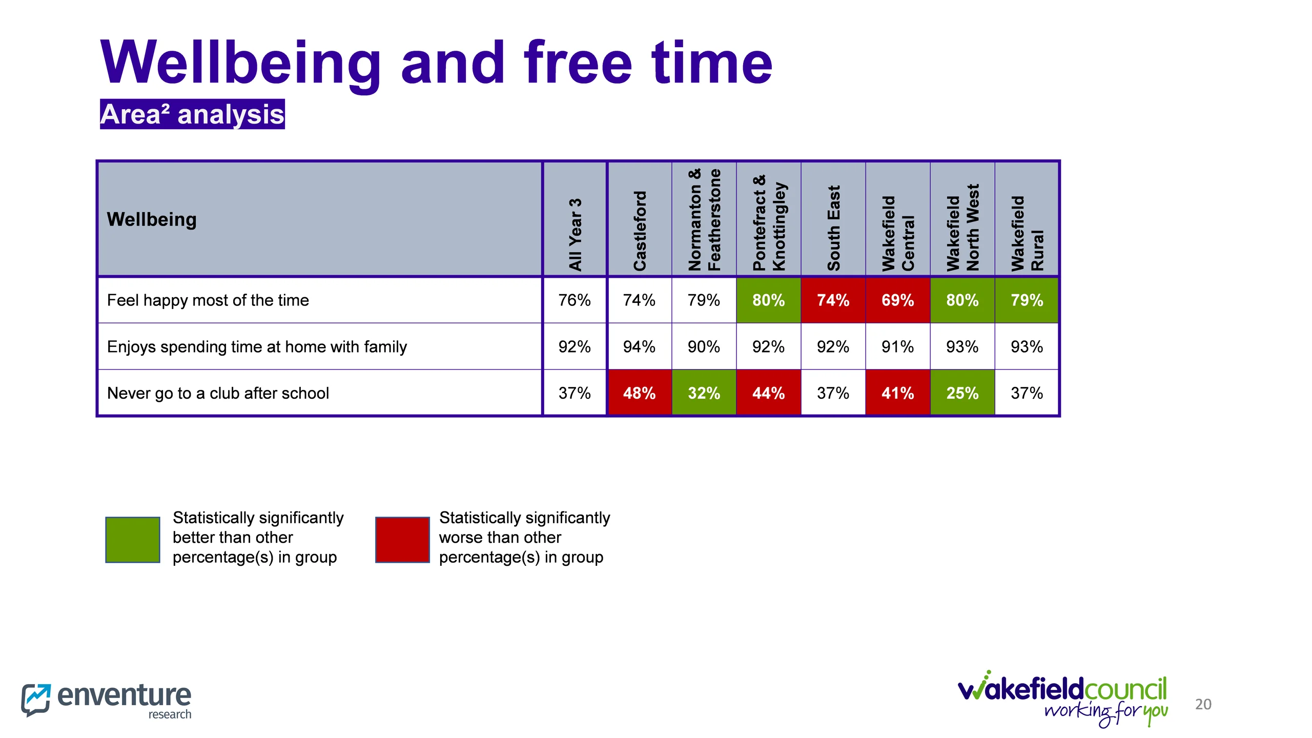 Wellbeing and free time Area² analysis Normanton & Featherstone Pontefract & Knottingley North West South East Castleford Wakefield Wakefield Wakefield All Year 3 Wellbeing Central Rural Feel happy most of the time 76% 74% 79% 80% 74% 69% 80% 79% Enjoys spending time at home with family 92% 94% 90% 92% 92% 91% 93% 93% Never go to a club after school 37% 37% 37% 48% 32% 44% 41% 25% Statistically significantly better than other percentage(s) in group Statistically significantly worse than other percentage(s) in group 20