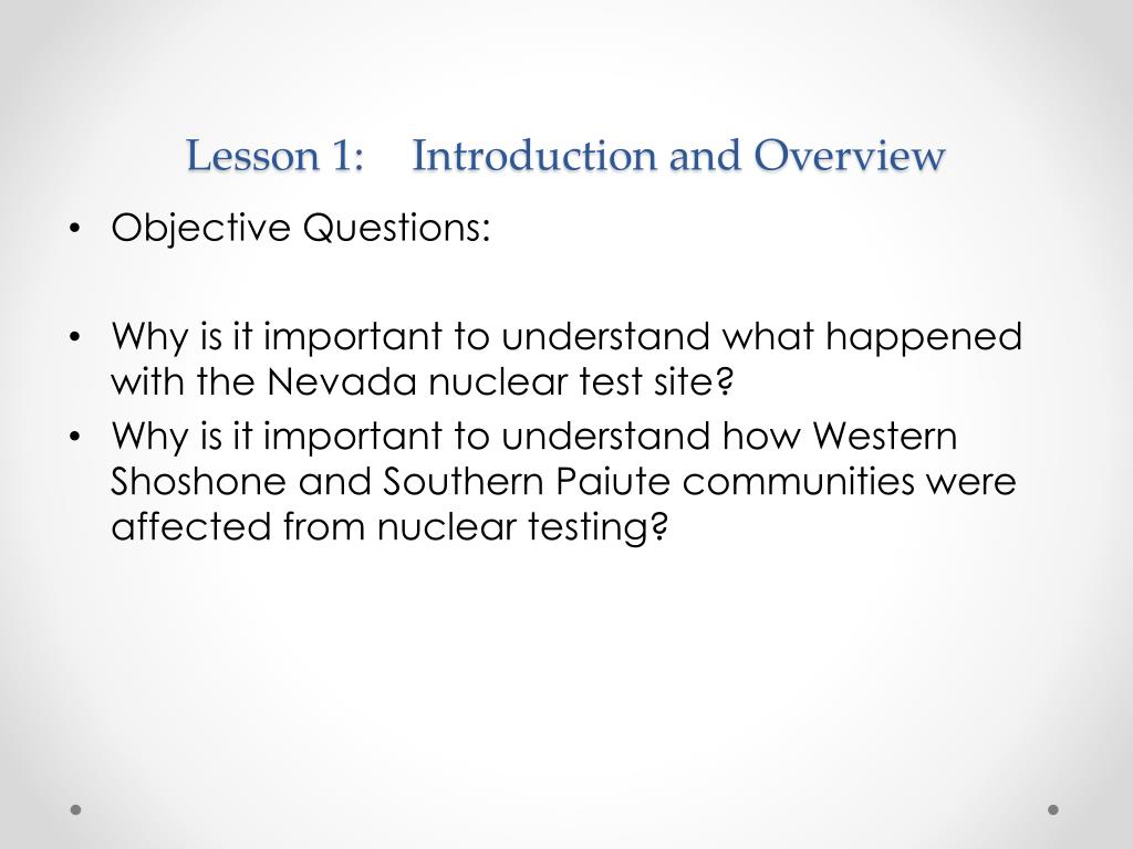 Lesson 1: Introduction and Overview • Objective Questions: • Why is it important to understand what happened with the Nevada nuclear test site? • Why is it important to understand how Western Shoshone and Southern Paiute communities were affected from nuclear testing?