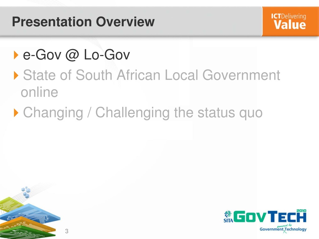 Presentation Overview • e-Gov @ Lo-Gov • State of South African Local Government online • Changing / Challenging the status quo