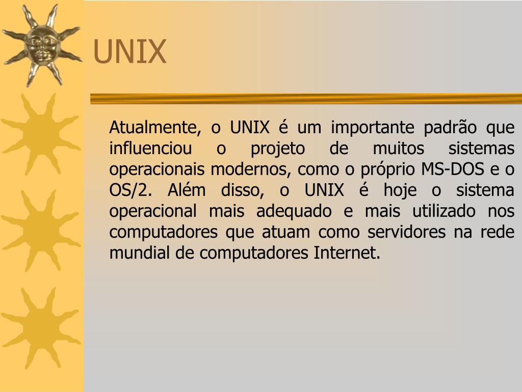 UNIX Atualmente, o UNIX é um importante padrão que influenciou o projeto de muitos sistemas operacionais modernos, como o próprio MS-DOS e o OS/2. Além disso, o UNIX é hoje o sistema operacional mais adequado e mais utilizado nos computadores que atuam como servidores na rede mundial de computadores Internet.