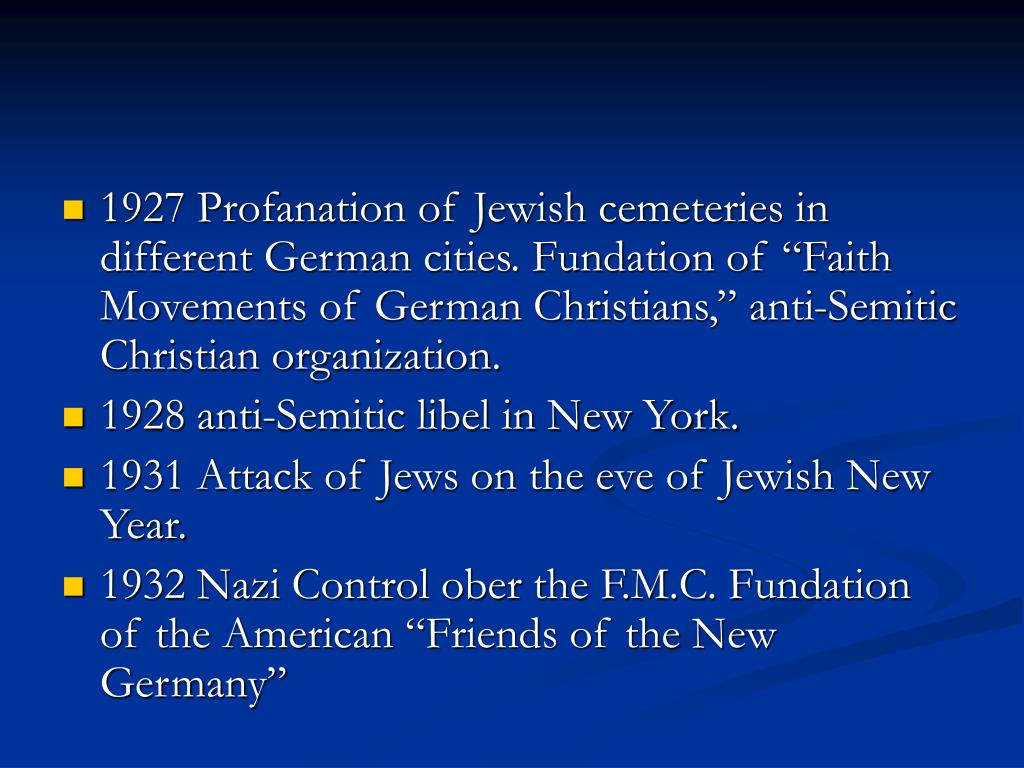 1927 Profanation of Jewish cemeteries in different German cities. Fundation of “Faith Movements of German Christians,” anti-Semitic Christian organization. • 1928 anti-Semitic libel in New York. • 1931 Attack of Jews on the eve of Jewish New Year. • 1932 Nazi Control ober the F.M.C. Fundation of the American “Friends of the New Germany”