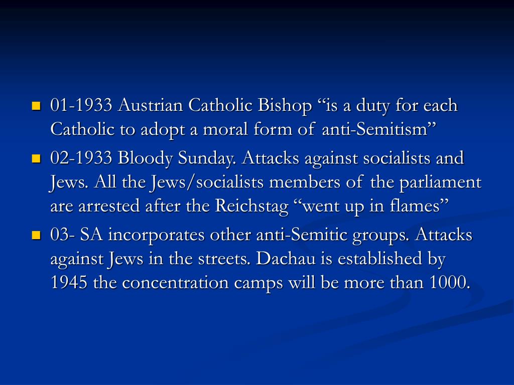 01-1933 Austrian Catholic Bishop “is a duty for each Catholic to adopt a moral form of anti-Semitism” • 02-1933 Bloody Sunday. Attacks against socialists and Jews. All the Jews/socialists members of the parliament are arrested after the Reichstag “went up in flames” • 03- SA incorporates other anti-Semitic groups. Attacks against Jews in the streets. Dachau is established by 1945 the concentration camps will be more than 1000.
