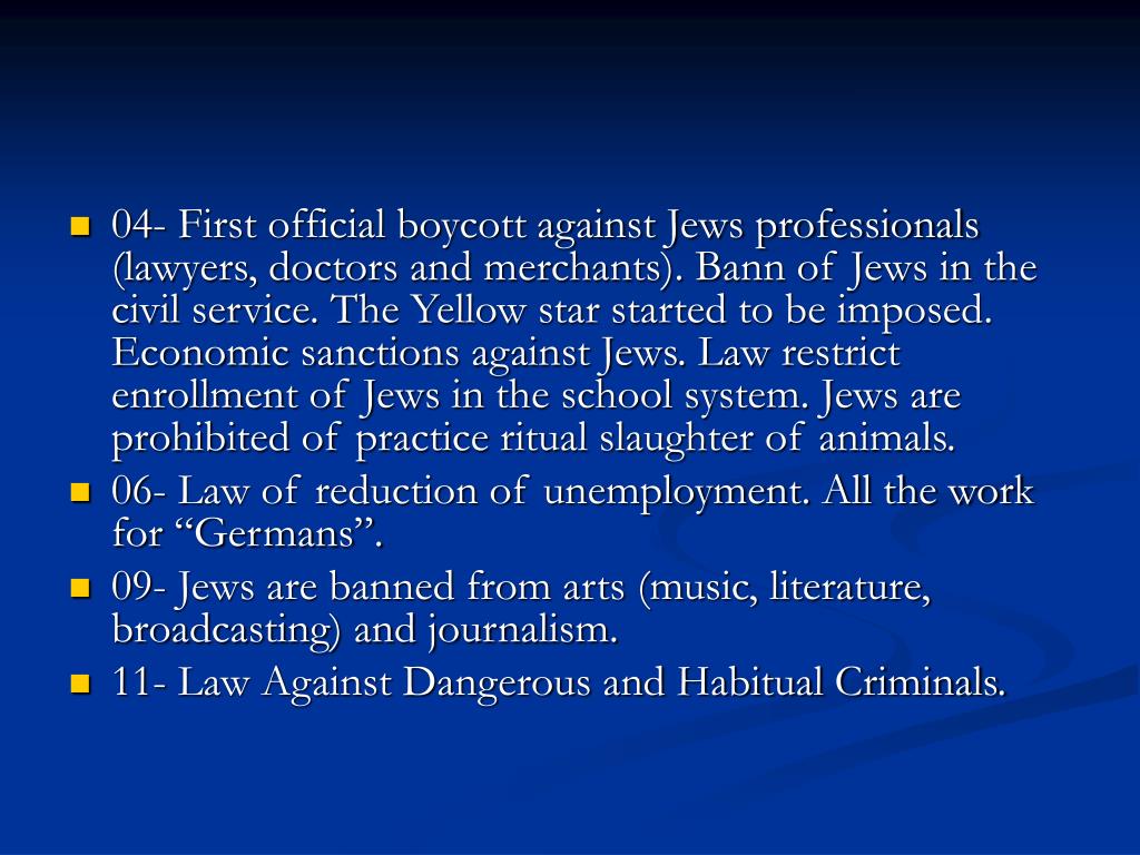 04- First official boycott against Jews professionals (lawyers, doctors and merchants). Bann of Jews in the civil service. The Yellow star started to be imposed. Economic sanctions against Jews. Law restrict enrollment of Jews in the school system. Jews are prohibited of practice ritual slaughter of animals. • 06- Law of reduction of unemployment. All the work for “Germans”. • 09- Jews are banned from arts (music, literature, broadcasting) and journalism. • 11- Law Against Dangerous and Habitual Criminals.
