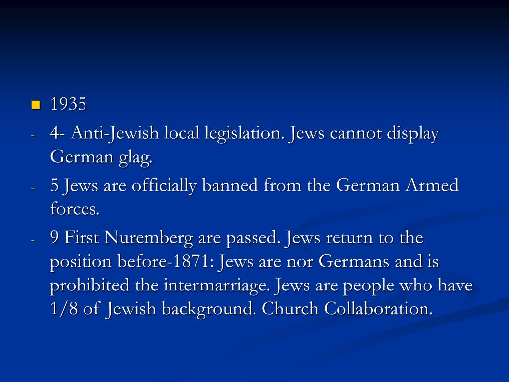 1935 • 4- Anti-Jewish local legislation. Jews cannot display German glag. • 5 Jews are officially banned from the German Armed forces. • 9 First Nuremberg are passed. Jews return to the position before-1871: Jews are nor Germans and is prohibited the intermarriage. Jews are people who have 1/8 of Jewish background. Church Collaboration.