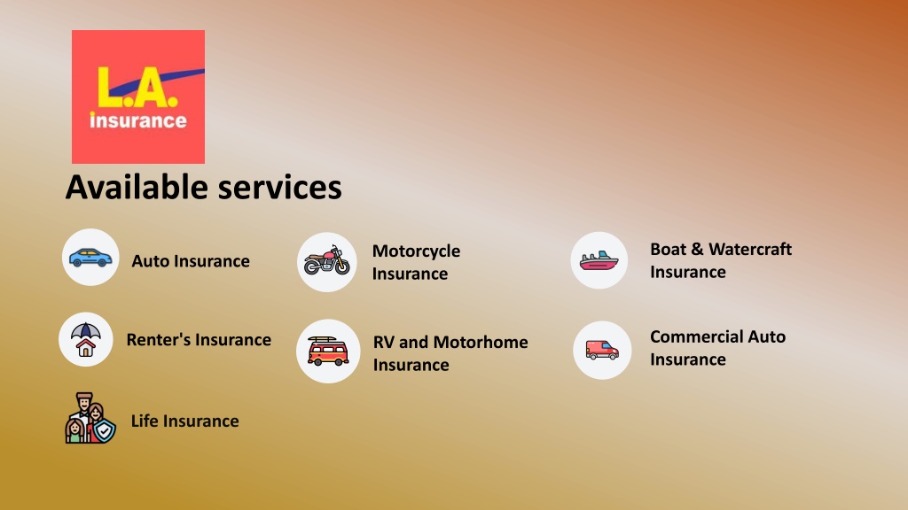 Available services Boat & Watercraft Insurance Motorcycle Insurance Auto Insurance Commercial Auto Insurance Renter's Insurance RV and Motorhome Insurance Life Insurance