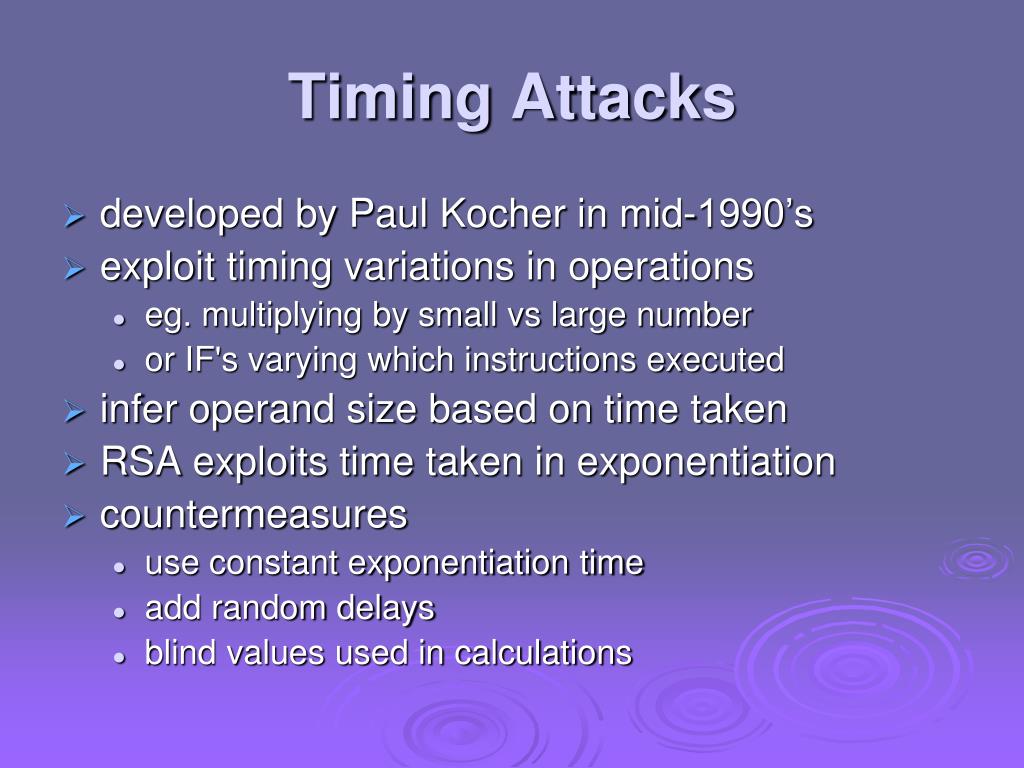 Timing Attacks • developed by Paul Kocher in mid-1990’s • exploit timing variations in operations • eg. multiplying by small vs large number • or IF's varying which instructions executed • infer operand size based on time taken • RSA exploits time taken in exponentiation • countermeasures • use constant exponentiation time • add random delays • blind values used in calculations