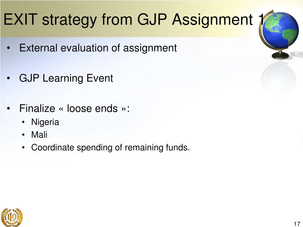 EXIT strategyfrom GJP Assignment 1 Externalevaluation of assignment GJP Learning Event Finalize « looseends »: • Nigeria • Mali • Coordinatespending of remainingfunds.