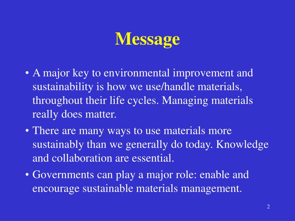 Message • A major key to environmental improvement and sustainability is how we use/handle materials, throughout their life cycles. Managing materials really does matter. • There are many ways to use materials more sustainably than we generally do today. Knowledge and collaboration are essential. • Governments can play a major role: enable and encourage sustainable materials management.