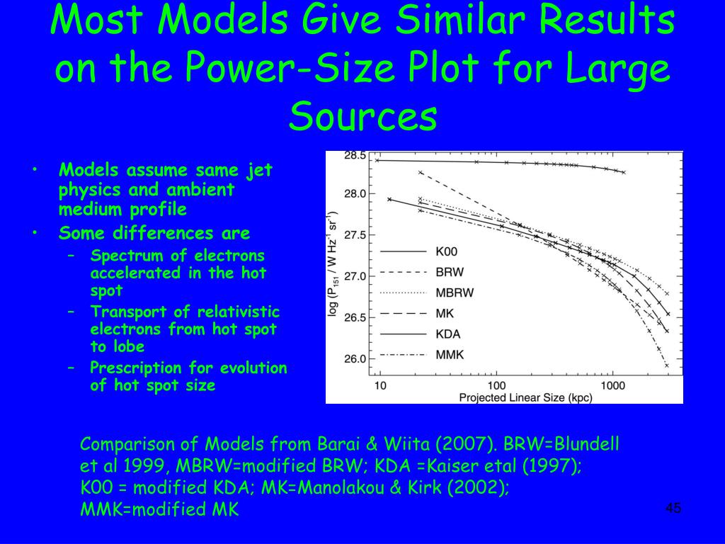 Most Models Give Similar Results on the Power-Size Plot for Large Sources • Models assume same jet physics and ambient medium profile • Some differences are • Spectrum of electrons accelerated in the hot spot • Transport of relativistic electrons from hot spot to lobe • Prescription for evolution of hot spot size Comparison of Models from Barai & Wiita (2007). BRW=Blundell et al 1999, MBRW=modified BRW; KDA =Kaiser etal (1997); K00 = modified KDA; MK=Manolakou & Kirk (2002); MMK=modified MK