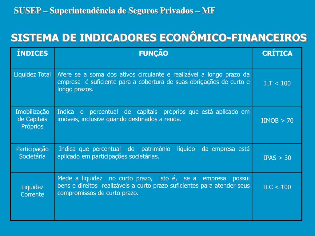 SUSEP – Superintendência de Seguros Privados – MF SISTEMA DE INDICADORES ECONÔMICO-FINANCEIROS Indicadores utilizados ( Seguradoras):