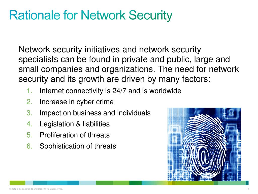 Network security initiatives and network security specialists can be found in private and public, large and small companies and organizations. The need for network security and its growth are driven by many factors: Internet connectivity is 24/7 and is worldwide Increase in cyber crime Impact on business and individuals Legislation & liabilities Proliferation of threats Sophistication of threats Rationale for Network Security