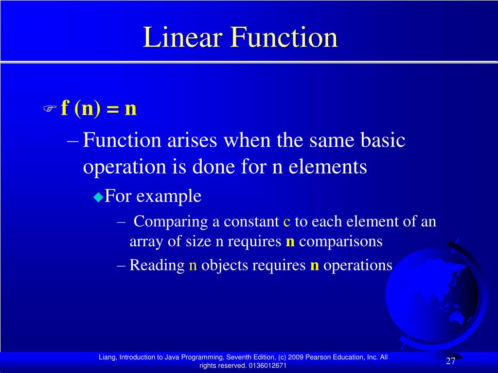 Linear Function • f (n) = n • Function arises when the same basic operation is done for n elements • For example • Comparing a constant c to each element of an array of size n requires n comparisons • Reading n objects requires n operations