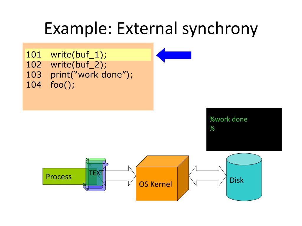 Example: External synchrony 101 write(buf_1); 102 write(buf_2); 103 print(“work done”); 104 foo(); %work done% % Disk OS Kernel TEXT Process