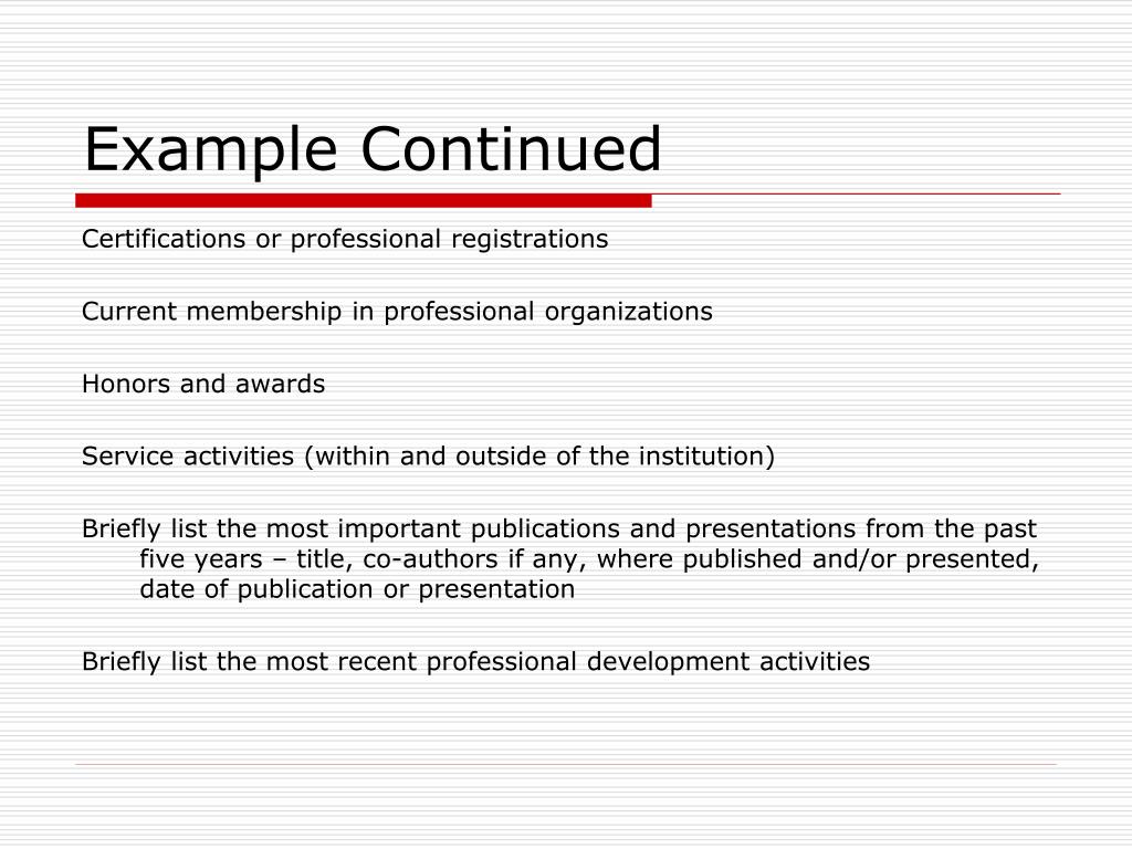 Example Continued Certifications or professional registrations Current membership in professional organizations Honors and awards Service activities (within and outside of the institution) Briefly list the most important publications and presentations from the past five years – title, co-authors if any, where published and/or presented, date of publication or presentation Briefly list the most recent professional development activities