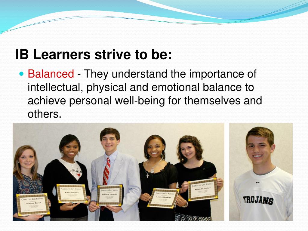 IB Learners strive to be: • Balanced - They understand the importance of intellectual, physical and emotional balance to achieve personal well-being for themselves and others.