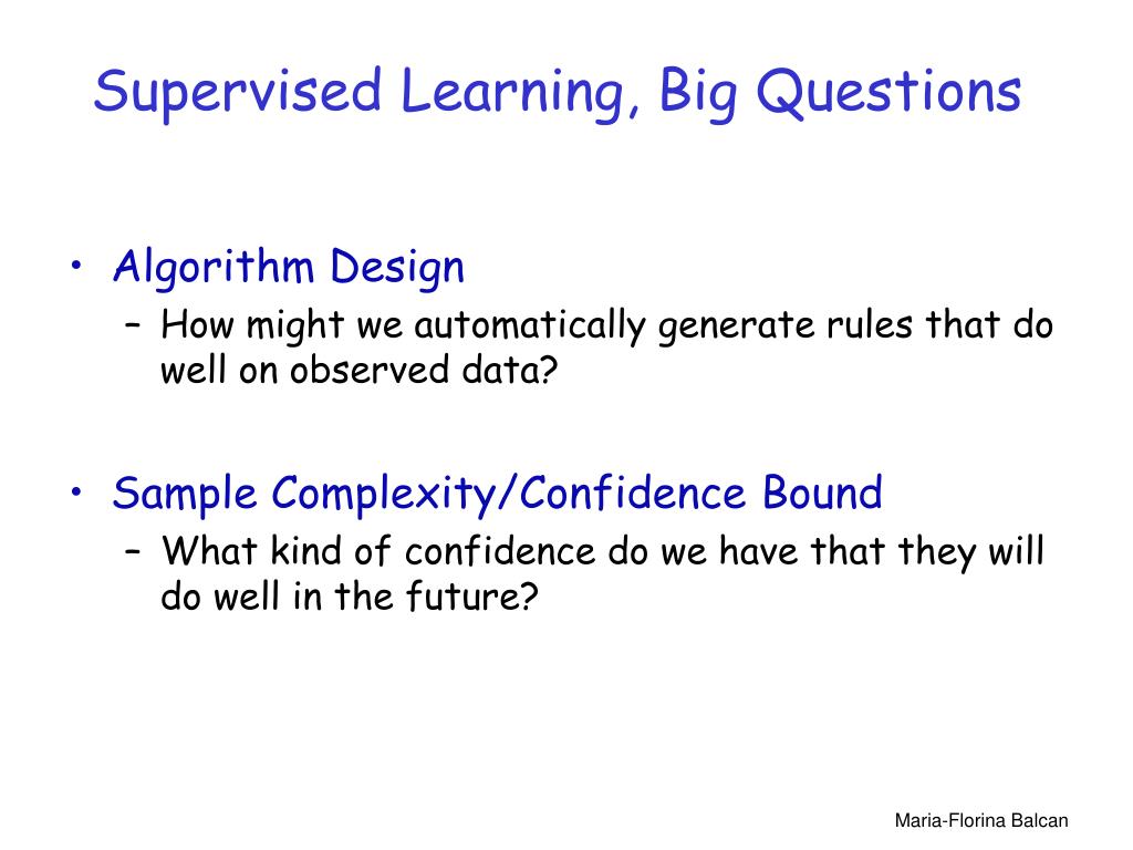 Supervised Learning, Big Questions • Algorithm Design • How might we automatically generate rules that do well on observed data? • Sample Complexity/Confidence Bound • What kind of confidence do we have that they will do well in the future? Maria-Florina Balcan
