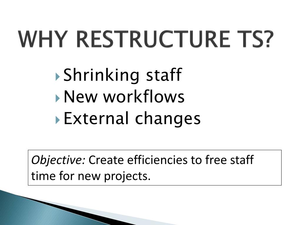 WHY RESTRUCTURE TS? • Shrinking staff • New workflows • External changes Objective: Create efficiencies to free staff time for new projects.