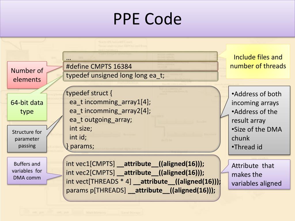 PPE Code It is the same as the aligned example … int vec1[CMPTS] __attribute__((aligned(32))); int vec2[CMPTS] __attribute__((aligned(32))); …