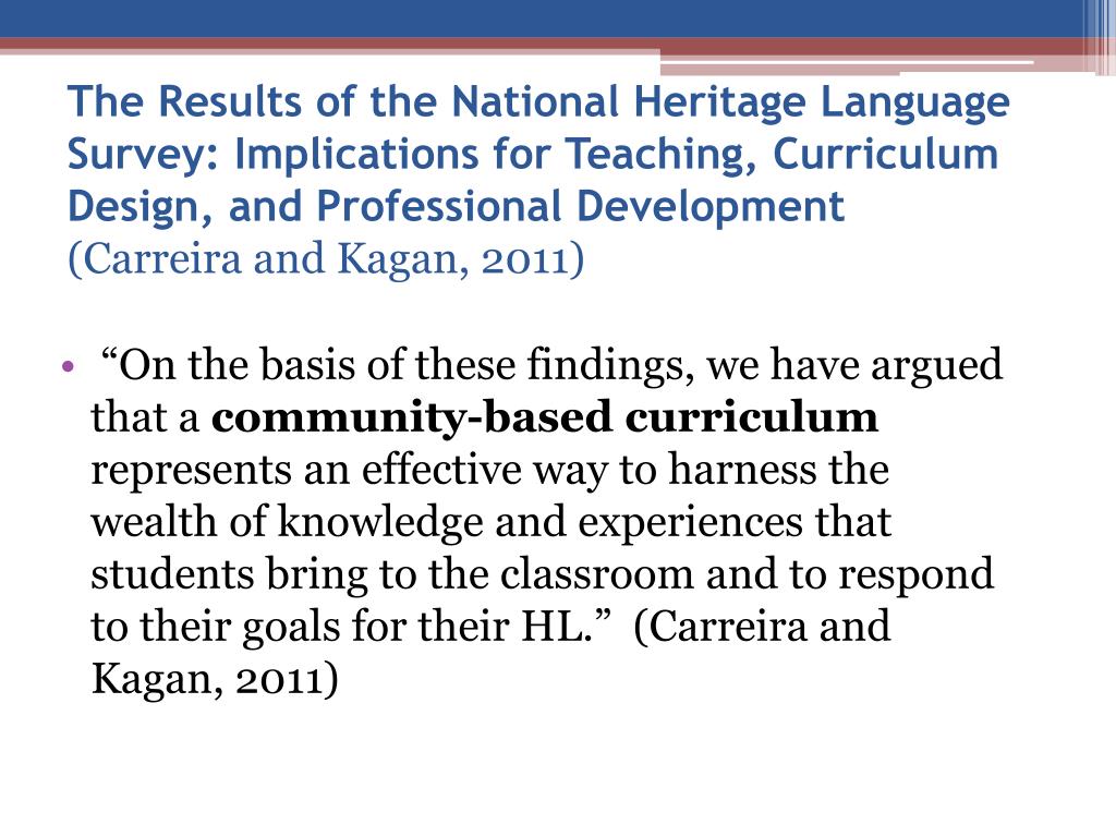 The Results of the National Heritage Language Survey: Implications for Teaching, Curriculum Design, and Professional Development (Carreira and Kagan, 2011) • “On the basis of these findings, we have argued that a community-based curriculum represents an effective way to harness the wealth of knowledge and experiences that students bring to the classroom and to respond to their goals for their HL.” (Carreira and Kagan, 2011)