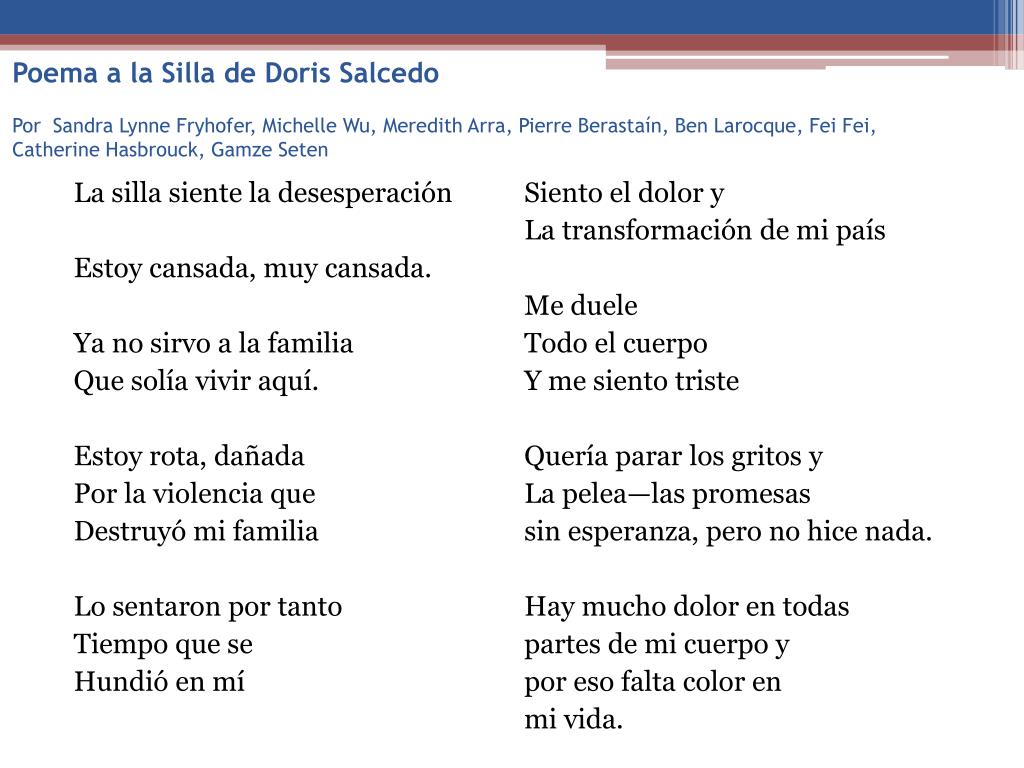 Poema a la Silla de Doris SalcedoPor Sandra Lynne Fryhofer, Michelle Wu, Meredith Arra, Pierre Berastaín, Ben Larocque, FeiFei, Catherine Hasbrouck, GamzeSeten La sillasiente la desesperación Estoycansada, muycansada. Ya no sirvo a la familia Quesolíaviviraquí. Estoyrota, dañada Por la violenciaque Destruyó mi familia Lo sentaronportanto Tiempoquese Hundió en mí Siento el dolor y La transformación de mi país Me duele Todo el cuerpo Y me sientotriste Queríaparar los gritos y La pelea—laspromesas sin esperanza, pero no hice nada. Hay mucho dolor en todas partes de mi cuerpo y poresofalta color en mi vida.