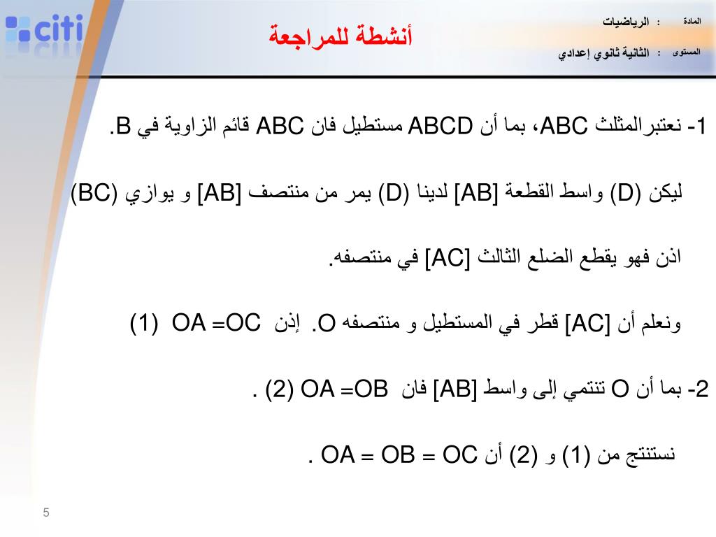 الرياضيات المادة: أنشطة للمراجعة الثانية ثانوي إعدادي المستوى: 1-نعتبرالمثلث ABC،بما أن ABCDمستطيل فان ABC قائم الزاوية فيB . ليكن (D) واسط القطعة [AB] لدينا (D) يمر من منتصف [AB]و يوازي (BC) اذن فهو يقطع الضلع الثالث [AC] في منتصفه. إذن OA =OC (1) ونعلم أن [AC] قطر في المستطيل و منتصفه O. 2- بما أن O تنتمي إلى واسط [AB] فان OA =OB (2) . نستنتج من (1) و (2) أنOA = OB = OC .