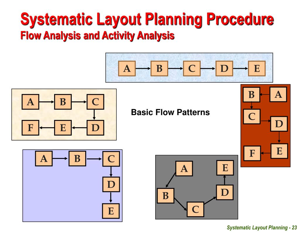 A B C D E A B A B C D A B C A B C E F E D F E A D D B E C Systematic Layout Planning ProcedureFlow Analysis and Activity Analysis Basic Flow Patterns Systematic Layout Planning - 23