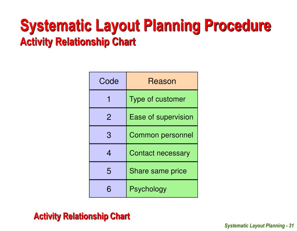 Code Reason 1 Type of customer 2 Ease of supervision 3 Common personnel 4 Contact necessary 5 Share same price 6 Psychology Systematic Layout Planning Procedure Activity Relationship Chart Activity Relationship Chart Systematic Layout Planning - 31