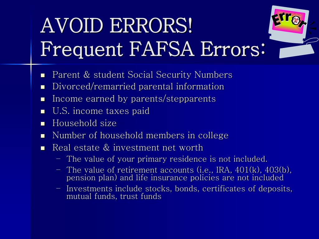 AVOID ERRORS!Frequent FAFSA Errors: • Parent & student Social Security Numbers • Divorced/remarried parental information • Income earned by parents/stepparents • U.S. income taxes paid • Household size • Number of household members in college • Real estate & investment net worth • The value of your primary residence is not included. • The value of retirement accounts (i.e., IRA, 401(k), 403(b), pension plan) and life insurance policies are not included • Investments include stocks, bonds, certificates of deposits, mutual funds, trust funds