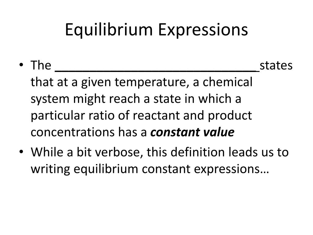 Equilibrium Expressions • The _____________________________ states that at a given temperature, a chemical system might reach a state in which a particular ratio of reactant and product concentrations has a constant value • While a bit verbose, this definition leads us to writing equilibrium constant expressions…