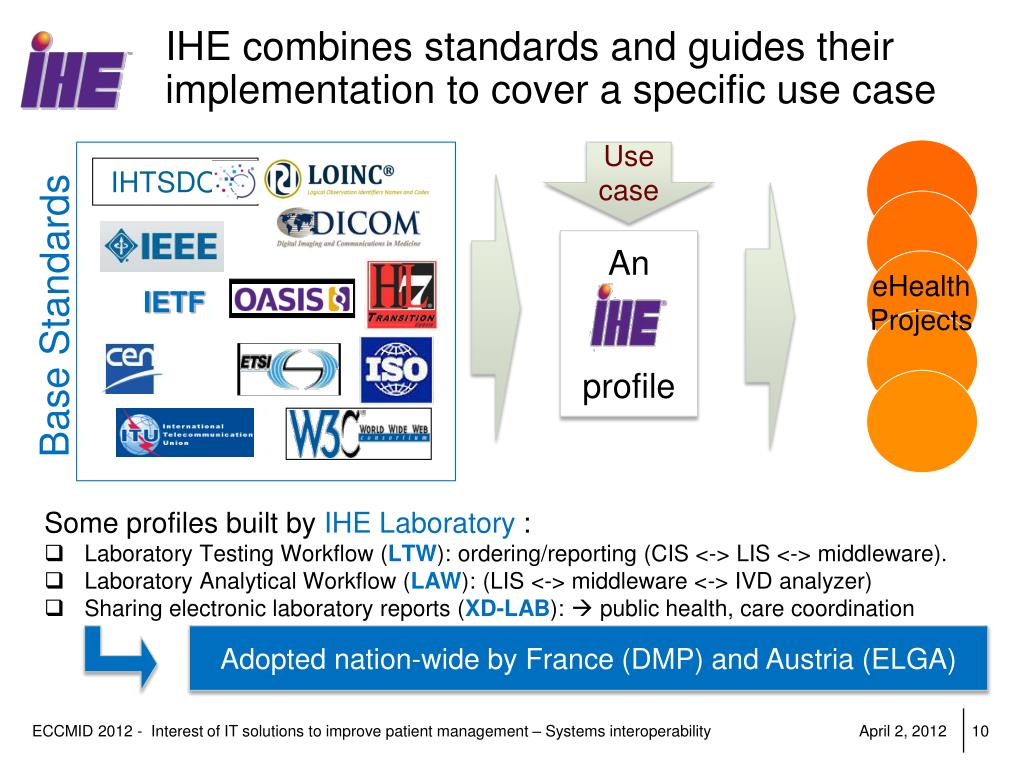 IHTSDO IHE combines standards and guides their implementation to cover a specific use case Use case An profile eHealth Projects IETF Base Standards Some profiles built by IHELaboratory : • Laboratory Testing Workflow (LTW): ordering/reporting (CIS <-> LIS <-> middleware). • Laboratory Analytical Workflow (LAW): (LIS <-> middleware <-> IVD analyzer) • Sharing electronic laboratory reports (XD-LAB): public health, care coordination Adopted nation-wide by France (DMP) and Austria (ELGA) ECCMID 2012 - Interest of IT solutions to improve patient management – Systems interoperability