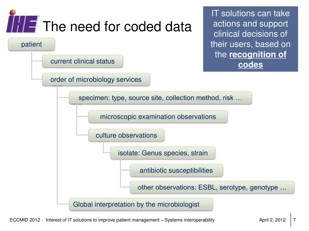 IT solutions can take actions and support clinical decisions of their users, based on the recognition of codes The need for coded data patient current clinical status order of microbiology services specimen: type, source site, collection method, risk … microscopic examination observations culture observations isolate: Genus species, strain antibiotic susceptibilities other observations: ESBL, serotype, genotype … Global interpretation by the microbiologist ECCMID 2012 - Interest of IT solutions to improve patient management – Systems interoperability