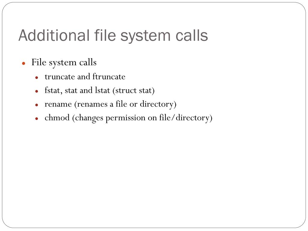Additional file system calls • File system calls • truncate and ftruncate • fstat, stat and lstat (struct stat) • rename (renames a file or directory) • chmod (changes permission on file/directory)