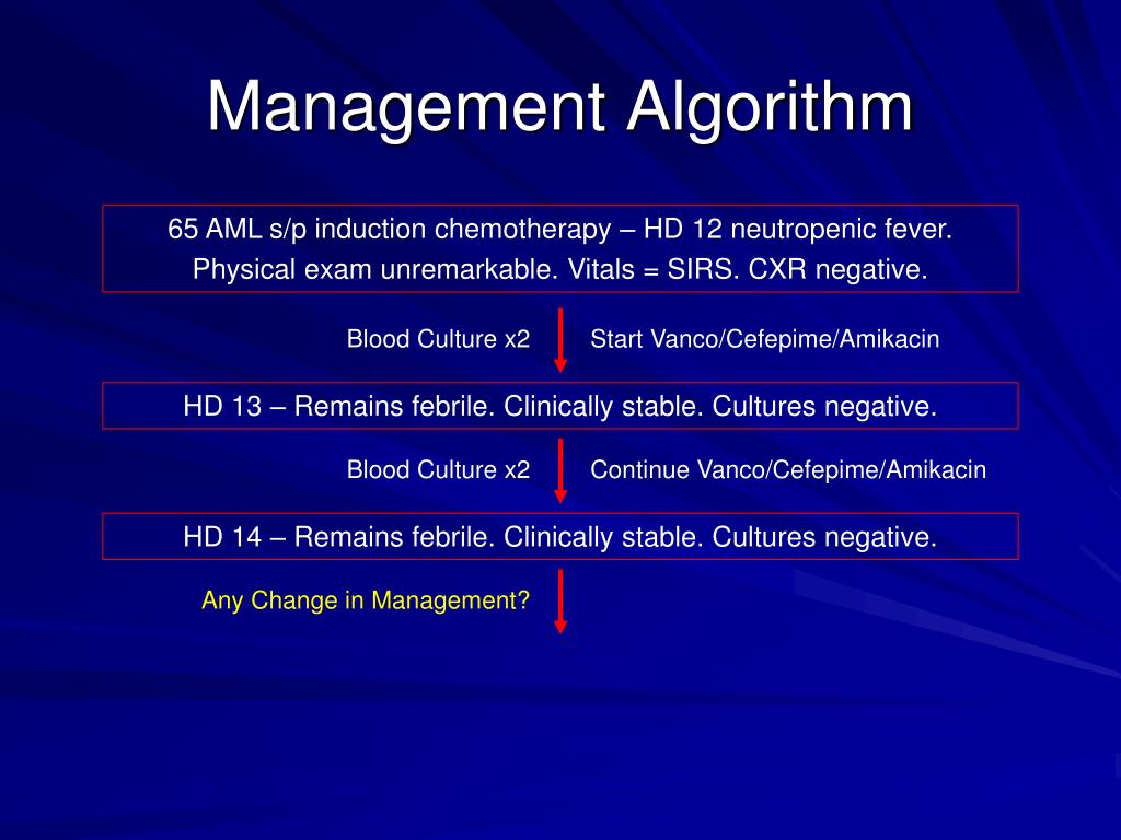 Management Algorithm 65 AML s/p induction chemotherapy – HD 12 neutropenic fever. Physical exam unremarkable. Vitals = SIRS. CXR negative. Blood Culture x2 Start Vanco/Cefepime/Amikacin HD 13 – Remains febrile. Clinically stable. Cultures negative. Blood Culture x2 Continue Vanco/Cefepime/Amikacin HD 14 – Remains febrile. Clinically stable. Cultures negative. Any Change in Management?