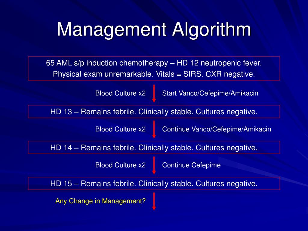 Management Algorithm 65 AML s/p induction chemotherapy – HD 12 neutropenic fever. Physical exam unremarkable. Vitals = SIRS. CXR negative. Blood Culture x2 Start Vanco/Cefepime/Amikacin HD 13 – Remains febrile. Clinically stable. Cultures negative. Blood Culture x2 Continue Vanco/Cefepime/Amikacin HD 14 – Remains febrile. Clinically stable. Cultures negative. Blood Culture x2 Continue Cefepime HD 15 – Remains febrile. Clinically stable. Cultures negative. Any Change in Management?