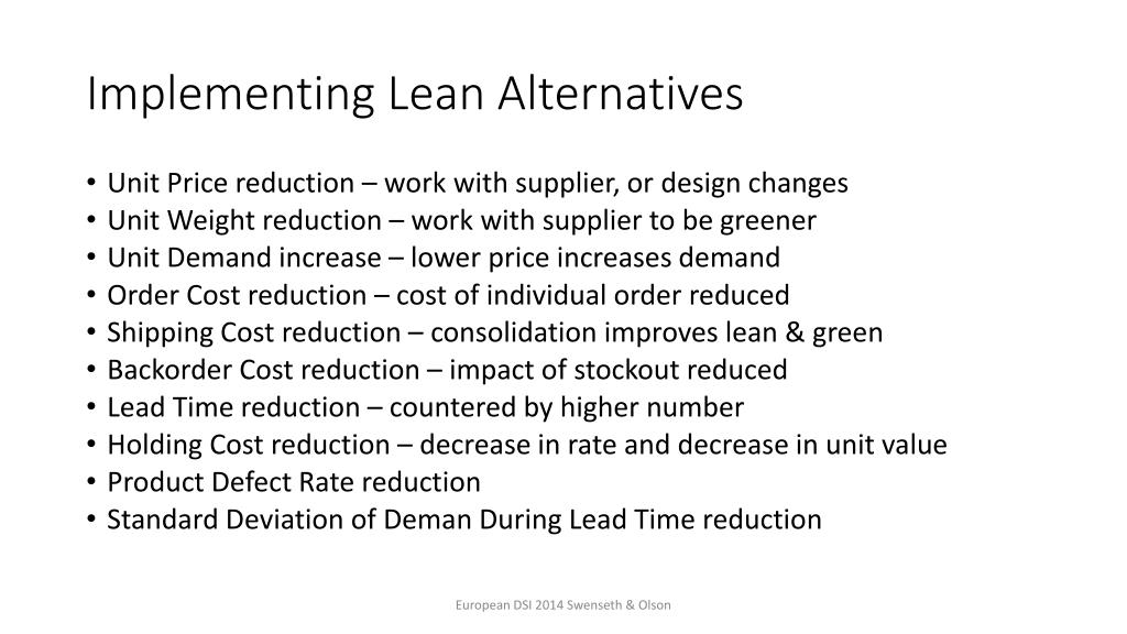 Implementing Lean Alternatives • Unit Price reduction – work with supplier, or design changes • Unit Weight reduction – work with supplier to be greener • Unit Demand increase – lower price increases demand • Order Cost reduction – cost of individual order reduced • Shipping Cost reduction – consolidation improves lean & green • Backorder Cost reduction – impact of stockout reduced • Lead Time reduction – countered by higher number • Holding Cost reduction – decrease in rate and decrease in unit value • Product Defect Rate reduction • Standard Deviation of Deman During Lead Time reduction European DSI 2014 Swenseth & Olson