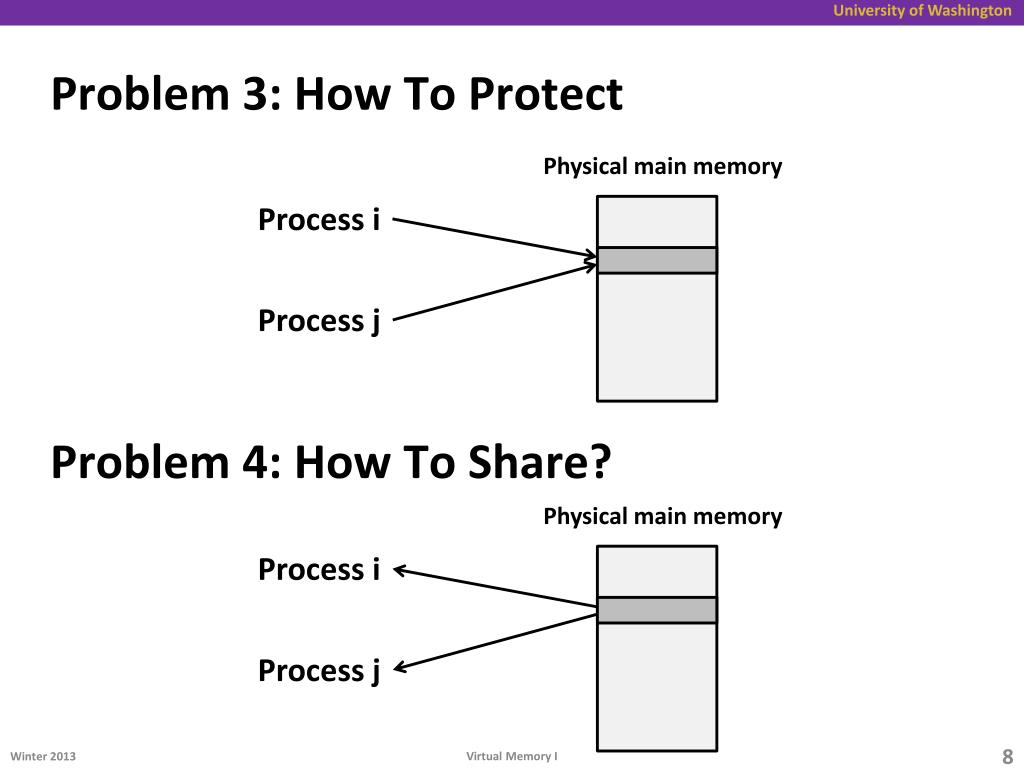 Problem 3: How To Protect Physical main memory Process i Process j Problem 4: How To Share? Physical main memory Process i Process j Virtual Memory I